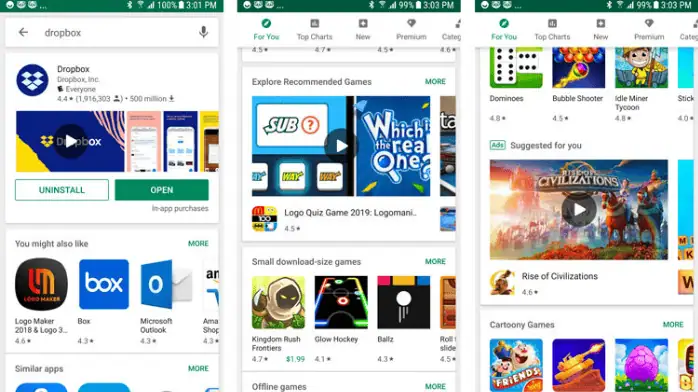 - ستجد أيضاً صفحة “الترتيب”، التي تعرض الألعاب والتطبيقات مصنفة ضمن فئات متعددة، منها “الرائجة”، وهي الألعاب والتطبيقات التي تم تحميلها بكثرة مؤخراً. ستجد أيضاً صفحة “الجديدة”، التي تضم أحدث التطبيقات والألعاب المضافة إلى المتجر، وصفحة “التحميل”، حيث يتم ترتيب الألعاب والتطبيقات حسب عدد مرات تحميلها منذ رفعها إلى “متجر جوجل بلاي للكمبيوتر”.