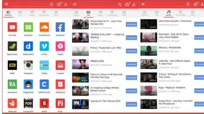 • ومن أبرز ميزات VidMate أيضًا دعمه لتنزيل الفيديوهات من العديد من المواقع الإلكترونية الشهيرة مثل يوتيوب، وفيسبوك، وديلي موشن، وغيرها من المنصات.